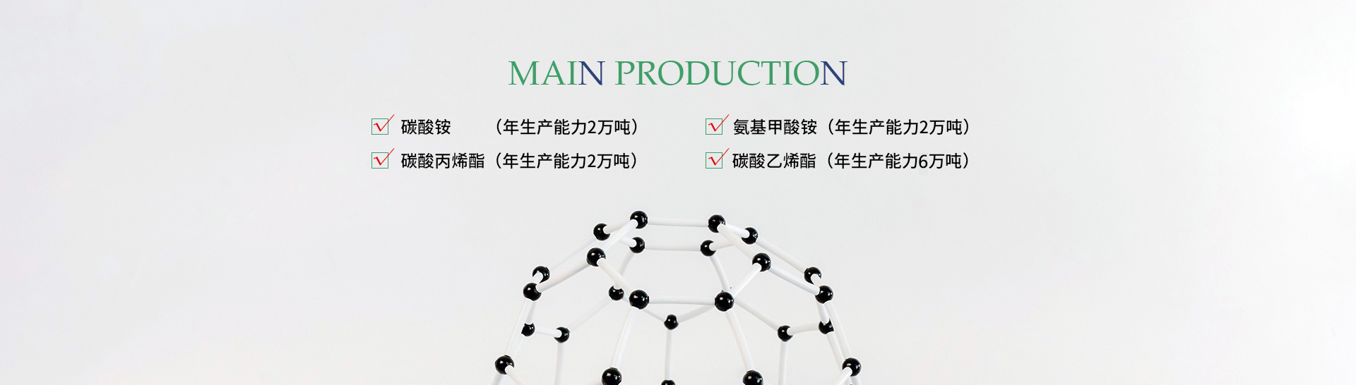 公司主要生產(chǎn)碳酸銨(年生產(chǎn)能力2萬(wàn)噸)、氨基甲酸銨(年生產(chǎn)能力2萬(wàn)噸)、碳酸丙烯酯(年生產(chǎn)能力2萬(wàn)噸)、碳酸乙烯酯(年生產(chǎn)能力6萬(wàn)噸)